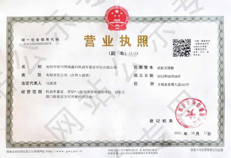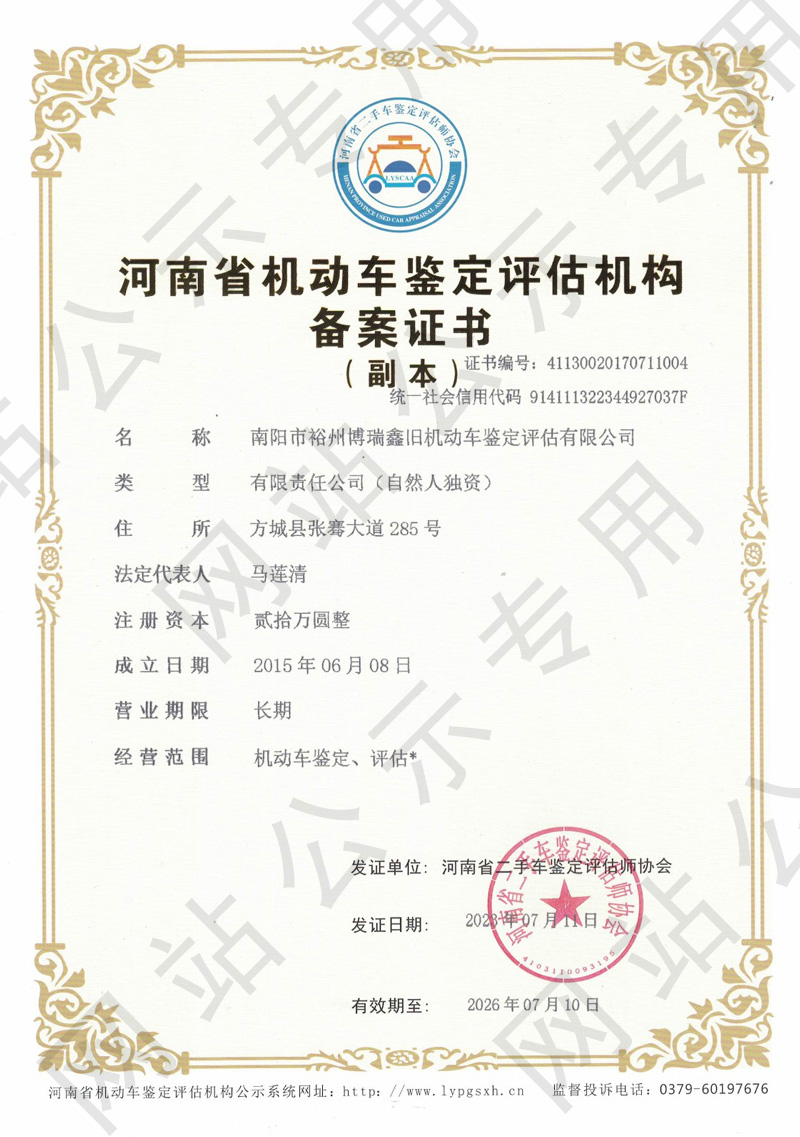 南阳市裕州博瑞鑫旧机动车鉴定评估有限公司